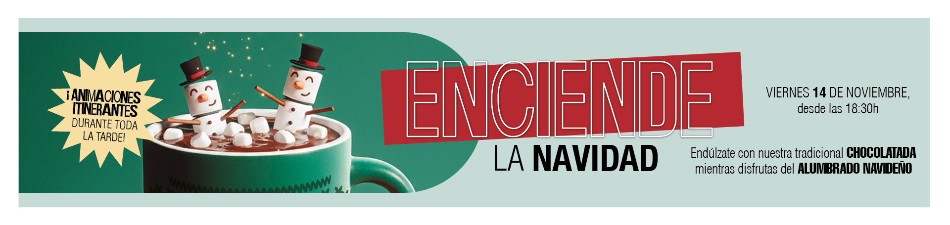 El viernes 14 de noviembre, como cada año, celebramos una chocolatada gratuita para todos los visitantes. Además, podremos disfrutar todos juntos de la inauguración del encendido navideño y de… ¡animaciones itinerantes durante toda la tarde!